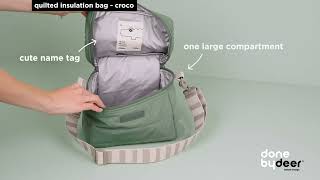 Den quiltede Croco-madkasse kombinerer funktionalitet og legesygt design. Tasken holder maden frisk takket være det isolerende stof og den vejrbestandige overflade, der beskytter mod snavs og fugt.