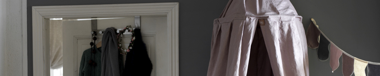 Senge- og vuggehimler - smukke og beroligende indretningsdetaljer i børneværelset Senge- og vuggehimler er ikke kun en smuk indretningsdetalje i børneværelset, men opfylder også en funktion for barnet. Forestil dig, at du ligger under en blød og luftig baldakin, som lukker verdens mange indtryk ude, når du skal sove. For børn er alting nyt, og for en lille baby kan det være utrolig rart at sortere i dagens indtryk, når det er tid til at sove. En tryg og hyggelig himmel er perfekt til dette. Den skaber en følelse af ro og tryghed, når barnet kigger op og langsomt, men sikkert falder i søvn. Vi har sengehimler og vuggehimler i forskellige designs En sengehimmel eller vuggehimmel kan sættes på enten den lange eller den korte side af sengen for at få forskellige effekter. Vi har flere forskellige sengehimler og vuggehimler i forskellige designs. Vi har lige sengehimler i blødt bomuldsstof, med eller uden farvede detaljer. Vi har også senge- og vuggehimler med flæser, som giver en utrolig sød effekt. Som altid er vi meget omhyggelige med at sikre, at de materialer, vi arbejder med, er kemikaliefrie og skånsomme mod børns hud. Med en krybbehimmel kan forældre skabe en blød og smuk indretningsdetalje på børneværelset, som også babyerne vil nyde.